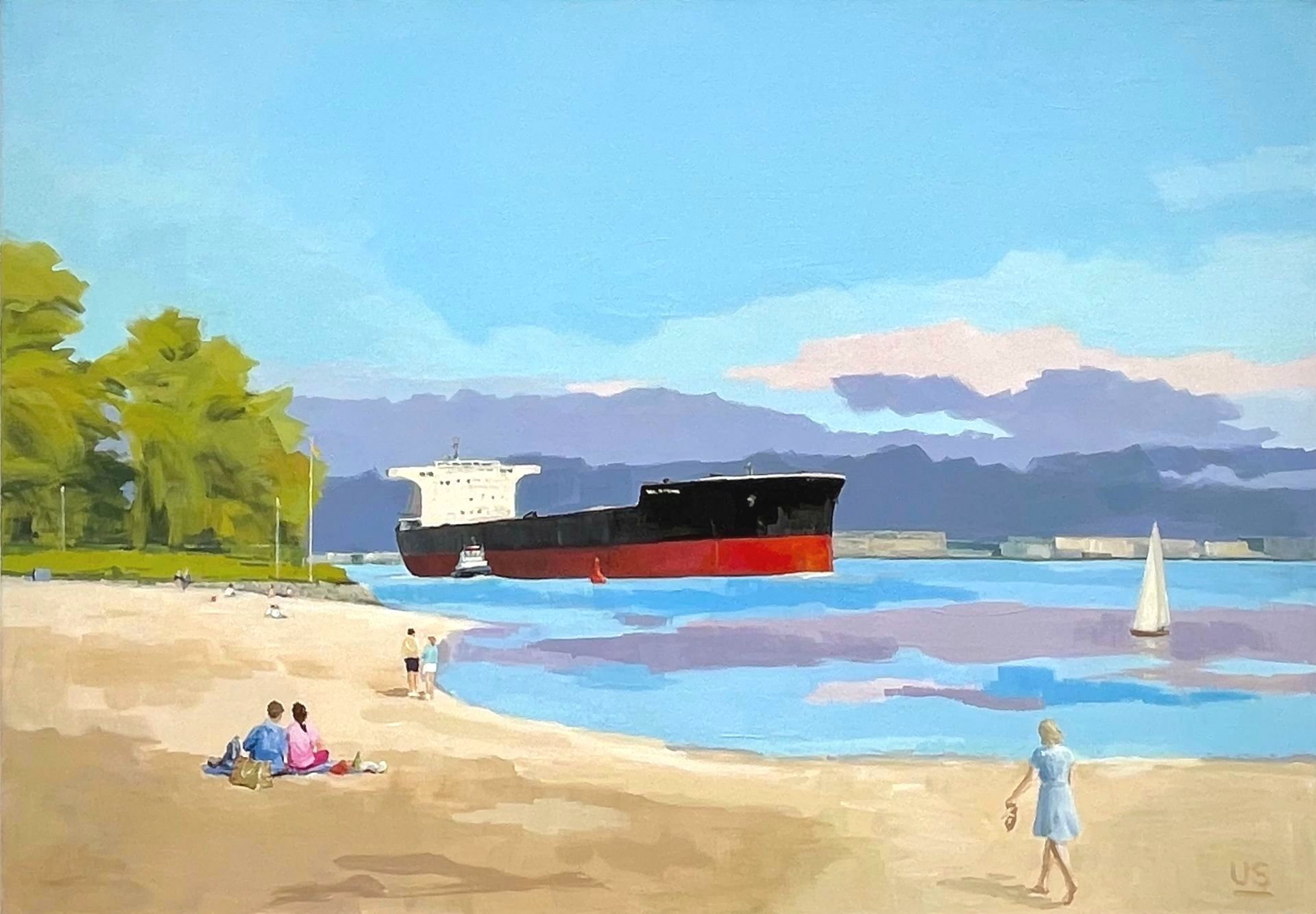 Zum Jahresende habe ich aufgrund eines Trauerfalls in der Familie leider nur wenig gemalt. Immerhin habe ich noch kurz zuvor dieses farbenfrohe Acrylbild fertiggestellt. Ein kleiner Trost in düsteren Zeiten. Das Bild ist 70 x 100 cm groß und zeigt eine Sommerszene am Strand von Blankenese, die ich vor einigen Monaten schon einmal, aber damals pleinair und viel kleiner in Gouache gemalt hatte.