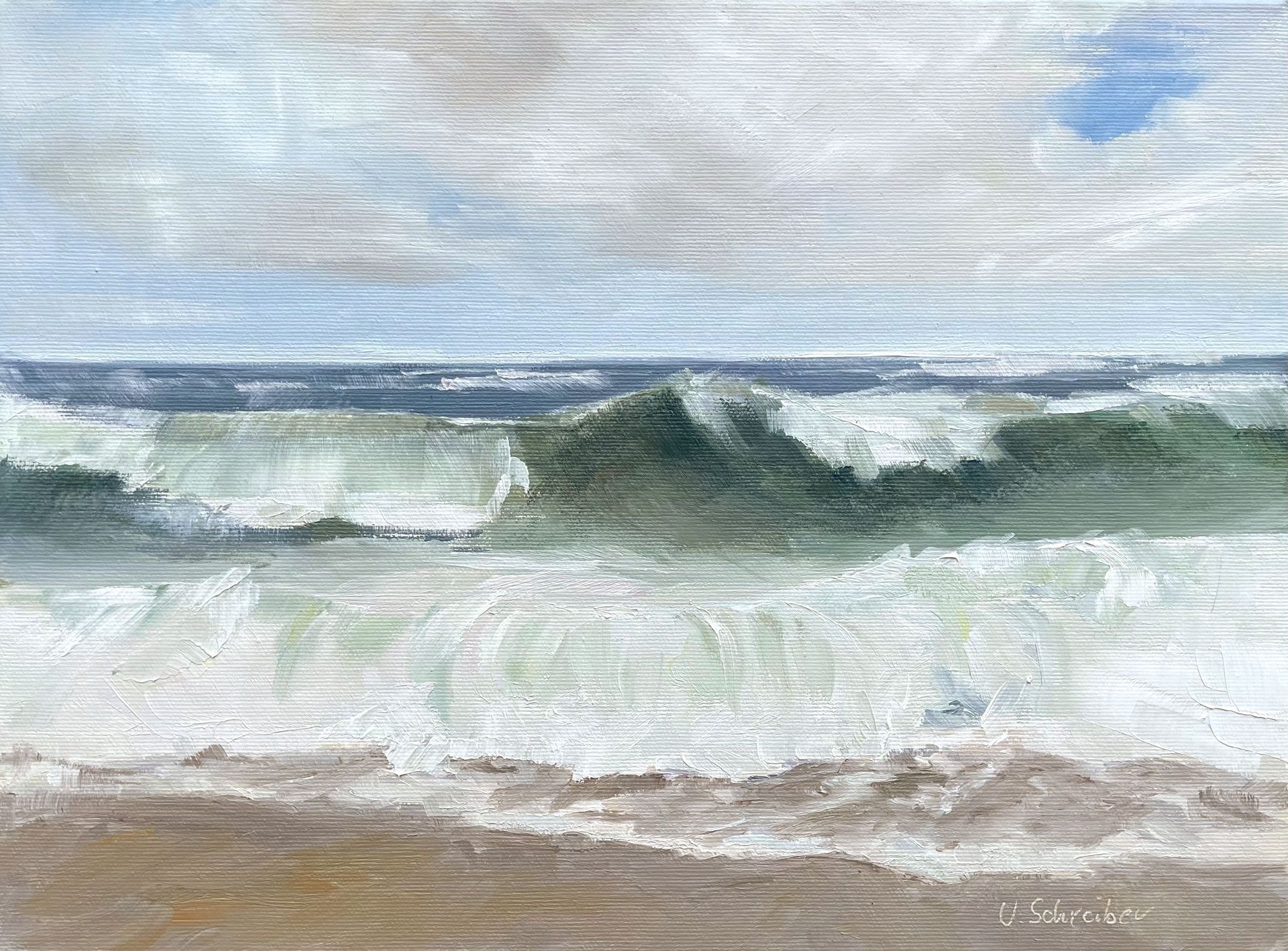Neues Jahr, neue Aufgaben: Im Januar steht bei mir handwerklich das Einüben der Spachteltechnik im Fokus. Die eignet sich meines Erachtens sehr gut für meine bevorzugten Motive wie Wellen und Strand. Aber es gibt einiges zu beachten. Zum Beispiel darf man nicht einfach die Ölfarbe dick auftragen. Das wäre nicht nur teuer, sondern würde auch zu langsam trocknen. Also übe ich das Anmischen mit einem Impasto-Medium und den anschließenden Auftrag mit verschiedenen Malmessern in einem Kurs der Hamburger Künstlerin Sophie Busch. Was für ein Spaß! Das Mischen und Spachteln fühlt sich ein bisschen wie damals an, als ich noch ein Kind war und die Schokocreme genussvoll auf dem Frühstückstisch verteilt habe ...